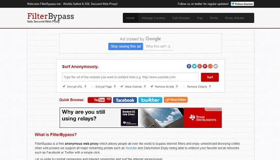 FilterBypass es un servicio de proxy gratuito que cuenta con medidas de seguridad extra fuertes que incluyen: encriptación de URL, encriptación de páginas web y la opción de desactivar scripts problemáticos y cookies (algo que por lo general sólo se consigue en servicios de pago).