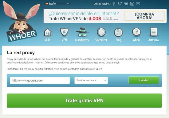 Whoer.net ofrece un servicio proxy gratuito que es muy útil para navegar de manera privada, si no tienes tiempo o los permisos necesarios para descargar software adicional o extensiones para tu navegador.