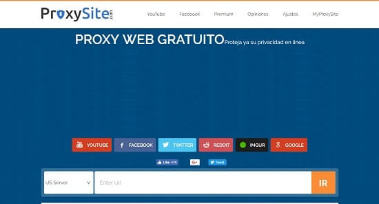 En la parte superior de la casilla de texto donde introduces la URL para usar el proxy, podrás encontrar varios botones que te permitirán acceder a varios sitios famosos usando el proxy de manera automática, tales como: Facebook, Reddit, YouTube, Imgur yTwitter.