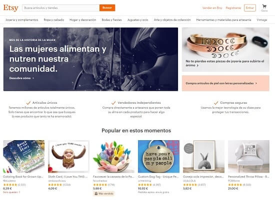 Etsy se especializa en artículos hechos a mano y elementos vintage, así como también suministros para manualidades.